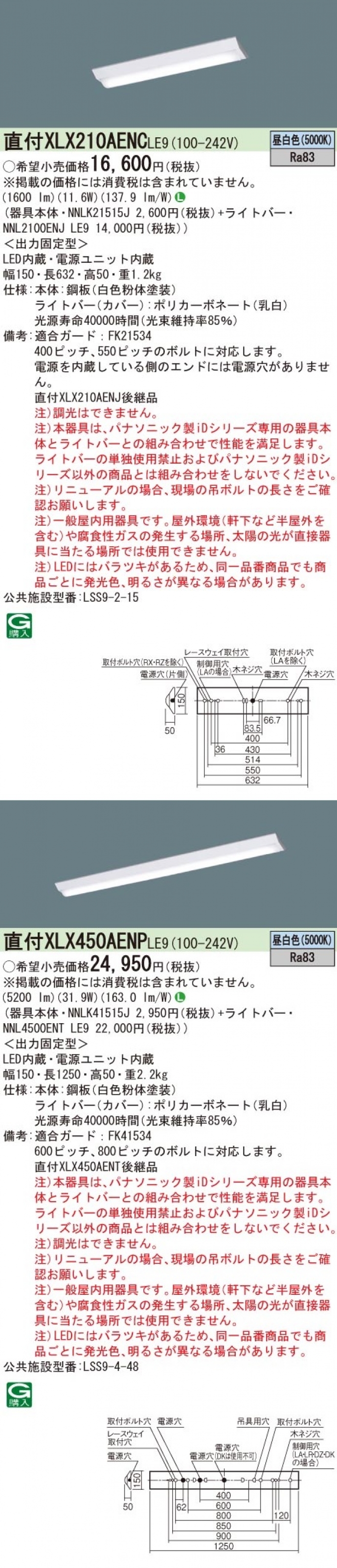 | iDシリーズ 20W 逆富士型 | セット型番:XLX210AENJLE9 器具本体:NNLK21515 ライトバー :NNL2100ENJLE9(1600ルーメン・5000K) 商品名 :一体型LEDベースライト 商品説明 :ワイド150mm幅 ---------------------------------------------- セット型番:XLX200AENJLE9 器具本体:NNLK21515 ライトバー :NNL2000ENJLE9(800ルーメン・5000K) 商品名 :一体型LEDベースライト 商品説明 :ワイド150mm幅 ---------------------------------------------- セット型番:XLX210DENJLE9 器具本体:NNLK22523 ライトバー :NNL2100ENJLE9(1600ルーメン・5000K) 商品名 :一体型LEDベースライト 商品説明 :ワイド230mm幅 ---------------------------------------------- セット型番:XLX200DENJLE9 器具本体:NNLK22523 ライトバー :NNL2000ENJLE9(800ルーメン・5000K) 商品名 :一体型LEDベースライト 商品説明 :ワイド230mm幅 |