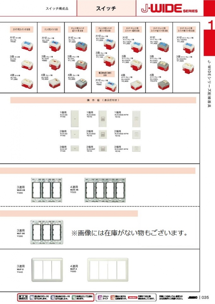 | 神保電器 J・WIDE・NKシリーズ スイッチ | 商品型番 :WJ-1 商品名 :表示なしスイッチ 商品説明 :片切 15A 300V ---------------------------------------------- 商品型番 :WJ-1CL 商品名 :チェック用スイッチ 低ワット 商品説明 :片切 0.5A 300V ---------------------------------------------- 商品型番 :WJ-1CR 商品名 :チェック用スイッチ 商品説明 :片切 4A 300V ---------------------------------------------- 商品型番 :WJ-3 商品名 :表示なしスイッチ 商品説明 :3路 15A 300V ---------------------------------------------- 商品型番 :WJ-3CL 商品名 :チェック用スイッチ 低ワット 商品説明 :3路 0.5A 300V ---------------------------------------------- 商品型番 :WJ-3CR 商品名 :チェック用スイッチ 商品説明 :3路 4A 300V ---------------------------------------------- 商品型番 :WJ-4 商品名 :表示なしスイッチ 商品説明 :4路 15A 300V ---------------------------------------------- 商品型番 :WJ-1G 商品名 :ガイド用スイッチ(スイッチがオフの時点灯) 商品説明 :片切 15A 300V(表示灯100V) ---------------------------------------------- 商品型番 :WJ-3G 商品名 :ガイド用スイッチ(スイッチがオフの時点灯) 商品説明 :3路 15A 300V(表示灯100V) ---------------------------------------------- 商品型番 :NKW01008 PW 商品名 :3路スイッチシングルセット 商品説明 :15A 300V(3路は片切としても使用可能) ---------------------------------------------- 商品型番 :NKW01008 SB(ソフトブラック) 商品名 :3路スイッチシングルセット 商品説明 :15A 300V(3路は片切としても使用可能) ---------------------------------------------- 商品型番 :NKW01008 SG(ソリッドグレー) 商品名 :3路スイッチシングルセット 商品説明 :15A 300V(3路は片切としても使用可能) ---------------------------------------------- 商品型番 :NKW01009 PW 商品名 :3路ガイドランプ付スイッチシングルセット 商品説明 :15A 300V(3路は片切としても使用可能) ---------------------------------------------- 商品型番 :NKW01009 SB(ソフトブラック) 商品名 :3路ガイドランプ付スイッチシングルセット 商品説明 :15A 300V(3路は片切としても使用可能) ---------------------------------------------- 商品型番 :NKW01009 SG(ソリッドグレー) 商品名 :3路ガイドランプ付スイッチシングルセット 商品説明 :15A 300V(3路は片切としても使用可能) ---------------------------------------------- 商品型番 :NKW01012 PW 商品名 :3路チェックランプ付スイッチ低ワット用シングルセット 商品説明 :15A 300V(3路は片切としても使用可能) ---------------------------------------------- 商品型番 :NKW01012 SB(ソフトブラック) 商品名 :3路チェックランプ付スイッチ低ワット用シングルセット 商品説明 :15A 300V(3路は片切としても使用可能) ---------------------------------------------- 商品型番 :NKW01012 SG(ソリッドグレー) 商品名 :3路チェックランプ付スイッチ低ワット用シングルセット 商品説明 :15A 300V(3路は片切としても使用可能) ---------------------------------------------- 商品型番 :NKW01014 PW 商品名 :4路スイッチシングルセット 商品説明 :15A 300V ---------------------------------------------- 商品型番 :NKW01014 SB(ソフトブラック) 商品名 :4路スイッチシングルセット 商品説明 :15A 300V ---------------------------------------------- 商品型番 :NKW01014 SG(ソリッドグレー) 商品名 :4路スイッチシングルセット 商品説明 :15A 300V ---------------------------------------------- 商品型番 :NKW02008 PW 商品名 :3路・4路スイッチダブルセット 商品説明 :15A 300V(3路は片切としても使用可能) ---------------------------------------------- 商品型番 :NKW02008 SB(ソフトブラック) 商品名 :3路・4路スイッチダブルセット 商品説明 :15A 300V(3路は片切としても使用可能) ---------------------------------------------- 商品型番 :NKW02008 SG(ソリッドグレー) 商品名 :3路・4路スイッチダブルセット 商品説明 :15A 300V(3路は片切としても使用可能) ---------------------------------------------- 商品型番 :NKW02308 PW 商品名 :3路・3路スイッチダブルセット 商品説明 :15A 300V(片切としても使用可能) ---------------------------------------------- 商品型番 :NKW02308 SB(ソフトブラック) 商品名 :3路・3路スイッチダブルセット 商品説明 :15A 300V(片切としても使用可能) ---------------------------------------------- 商品型番 :NKW02308 SG(ソリッドグレー) 商品名 :3路・3路スイッチダブルセット 商品説明 :15A 300V(片切としても使用可能) ---------------------------------------------- 商品型番 :NKW02014 PW 商品名 :4路・4路スイッチダブルセット 商品説明 :15A 300V ---------------------------------------------- 商品型番 :NKW02014 SB(ソフトブラック) 商品名 :4路・4路スイッチダブルセット 商品説明 :15A 300V ---------------------------------------------- 商品型番 :NKW02014 SG(ソリッドグレー) 商品名 :4路・4路スイッチダブルセット 商品説明 :15A 300V ---------------------------------------------- 商品型番 :NKW03008 PW 商品名 :3路・3路・3路スイッチトリプルセット 商品説明 :15A 300V(片切としても使用可能) ---------------------------------------------- 商品型番 :NKW03008 SB(ソフトブラック) 商品名 :3路・3路・3路スイッチトリプルセット 商品説明 :15A 300V(片切としても使用可能) ---------------------------------------------- 商品型番 :NKW03008 SG(ソリッドグレー) 商品名 :3路