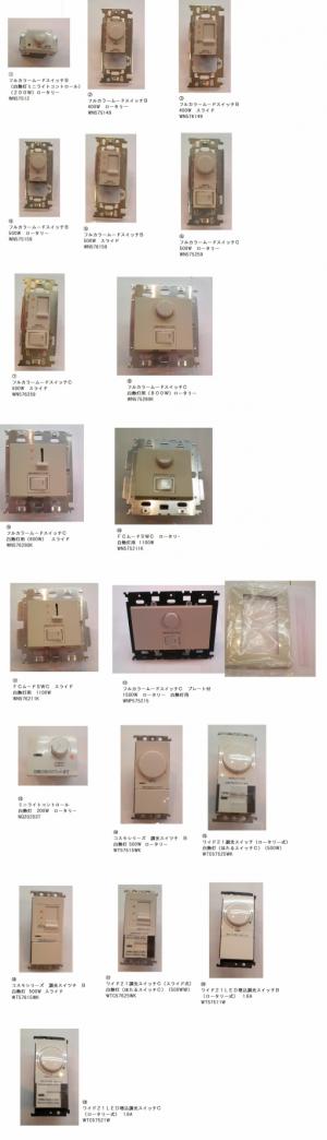 | ① フルカラームードスイッチB (白熱灯ミニライトコントロ-ル) (200W)ロータリー WN57512 ② フルカラームードスイッチB 400W ロータリー WN575149 ③ フルカラームードスイッチB 400W スライド WN576149 ④ フルカラームードスイッチB 500W ロータリー WN575159 ⑤ フルカラームードスイッチB 500W スライド WN576159 ⑥ フルカラームードスイッチC 500W ロータリー WN575259 ⑦ フルカラームードスイッチC 500W スライド WN576259 ⑧ フルカラームードスイッチC 白熱灯用(800W)ロータリー WN575280K ⑨ フルカラームードスイッチC 白熱灯用(800W) スライド WN576280K ⑩ FCム-ドSWC ロータリ- 白熱灯用 1100W WN575211K ⑪ FCム-ドSWC スライド 白熱灯用 1100W WN576211K ⑫ フルカラームードスイッチC プレ-ト付 1500W ロ-タリ- 白熱灯用 WNP575215 ⑬ ミニライトコントロ-ル 白熱灯 200W ロ-タリ- NQ20203T ⑭ コスモシリ-ズ 調光スイツチ B 白熱灯 500W ロ-タリ- WT57515WK ⑮ ワイド21調光スイッチ(ロータリー式) 白熱灯(ほたるスイッチC)(500W) WTC57525WK ⑯ コスモシリ-ズ 調光スイツチ B 白熱灯 500W スライド WT57615WK ⑰ ワイド21調光スイッチC(スライド式) 白熱灯(ほたるスイッチC)(500WW) WTC57625WK ⑱ ワイド21LED埋込調光スイッチB (ロータリー式) 1.6A WT57511W ⑲ ワイド21LED埋込調光スイッチC (ロータリー式) 1.6A WTC57521W |