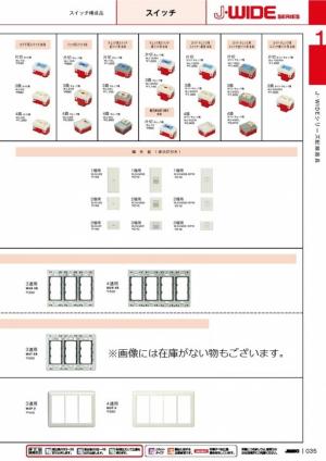 | 商品型番 :WJ-1 商品名 :表示なしスイッチ 商品説明 :片切 15A 300V ---------------------------------------------- 商品型番 :WJ-1CL 商品名 :チェック用スイッチ 低ワット 商品説明 :片切 0.5A 300V ---------------------------------------------- 商品型番 :WJ-1CR 商品名 :チェック用スイッチ 商品説明 :片切 4A 300V ---------------------------------------------- 商品型番 :WJ-3 商品名 :表示なしスイッチ 商品説明 :3路 15A 300V ---------------------------------------------- 商品型番 :WJ-3CL 商品名 :チェック用スイッチ 低ワット 商品説明 :3路 0.5A 300V ---------------------------------------------- 商品型番 :WJ-3CR 商品名 :チェック用スイッチ 商品説明 :3路 4A 300V ---------------------------------------------- 商品型番 :WJ-4 商品名 :表示なしスイッチ 商品説明 :4路 15A 300V ---------------------------------------------- 商品型番 :WJ-1G 商品名 :ガイド用スイッチ(スイッチがオフの時点灯) 商品説明 :片切 15A 300V(表示灯100V) ---------------------------------------------- 商品型番 :WJ-3G 商品名 :ガイド用スイッチ(スイッチがオフの時点灯) 商品説明 :3路 15A 300V(表示灯100V) ---------------------------------------------- 商品型番 :NKW01008 PW 商品名 :3路スイッチシングルセット 商品説明 :15A 300V(3路は片切としても使用可能) ---------------------------------------------- 商品型番 :NKW01008 SB(ソフトブラック) 商品名 :3路スイッチシングルセット 商品説明 :15A 300V(3路は片切としても使用可能) ---------------------------------------------- 商品型番 :NKW01008 SG(ソリッドグレー) 商品名 :3路スイッチシングルセット 商品説明 :15A 300V(3路は片切としても使用可能) ---------------------------------------------- 商品型番 :NKW01009 PW 商品名 :3路ガイドランプ付スイッチシングルセット 商品説明 :15A 300V(3路は片切としても使用可能) ---------------------------------------------- 商品型番 :NKW01009 SB(ソフトブラック) 商品名 :3路ガイドランプ付スイッチシングルセット 商品説明 :15A 300V(3路は片切としても使用可能) ---------------------------------------------- 商品型番 :NKW01009 SG(ソリッドグレー) 商品名 :3路ガイドランプ付スイッチシングルセット 商品説明 :15A 300V(3路は片切としても使用可能) ---------------------------------------------- 商品型番 :NKW01012 PW 商品名 :3路チェックランプ付スイッチ低ワット用シングルセット 商品説明 :15A 300V(3路は片切としても使用可能) ---------------------------------------------- 商品型番 :NKW01012 SB(ソフトブラック) 商品名 :3路チェックランプ付スイッチ低ワット用シングルセット 商品説明 :15A 300V(3路は片切としても使用可能) ---------------------------------------------- 商品型番 :NKW01012 SG(ソリッドグレー) 商品名 :3路チェックランプ付スイッチ低ワット用シングルセット 商品説明 :15A 300V(3路は片切としても使用可能) ---------------------------------------------- 商品型番 :NKW01014 PW 商品名 :4路スイッチシングルセット 商品説明 :15A 300V ---------------------------------------------- 商品型番 :NKW01014 SB(ソフトブラック) 商品名 :4路スイッチシングルセット 商品説明 :15A 300V ---------------------------------------------- 商品型番 :NKW01014 SG(ソリッドグレー) 商品名 :4路スイッチシングルセット 商品説明 :15A 300V ---------------------------------------------- 商品型番 :NKW02008 PW 商品名 :3路・4路スイッチダブルセット 商品説明 :15A 300V(3路は片切としても使用可能) ---------------------------------------------- 商品型番 :NKW02008 SB(ソフトブラック) 商品名 :3路・4路スイッチダブルセット 商品説明 :15A 300V(3路は片切としても使用可能) ---------------------------------------------- 商品型番 :NKW02008 SG(ソリッドグレー) 商品名 :3路・4路スイッチダブルセット 商品説明 :15A 300V(3路は片切としても使用可能) ---------------------------------------------- 商品型番 :NKW02308 PW 商品名 :3路・3路スイッチダブルセット 商品説明 :15A 300V(片切としても使用可能) ---------------------------------------------- 商品型番 :NKW02308 SB(ソフトブラック) 商品名 :3路・3路スイッチダブルセット 商品説明 :15A 300V(片切としても使用可能) ---------------------------------------------- 商品型番 :NKW02308 SG(ソリッドグレー) 商品名 :3路・3路スイッチダブルセット 商品説明 :15A 300V(片切としても使用可能) ---------------------------------------------- 商品型番 :NKW02014 PW 商品名 :4路・4路スイッチダブルセット 商品説明 :15A 300V ---------------------------------------------- 商品型番 :NKW02014 SB(ソフトブラック) 商品名 :4路・4路スイッチダブルセット 商品説明 :15A 300V ---------------------------------------------- 商品型番 :NKW02014 SG(ソリッドグレー) 商品名 :4路・4路スイッチダブルセット 商品説明 :15A 300V ---------------------------------------------- 商品型番 :NKW03008 PW 商品名 :3路・3路・3路スイッチトリプルセット 商品説明 :15A 300V(片切としても使用可能) ---------------------------------------------- 商品型番 :NKW03008 SB(ソフトブラック) 商品名 :3路・3路・3路スイッチトリプルセット 商品説明 :15A 300V(片切としても使用可能) ---------------------------------------------- 商品型番 :NKW03008 SG(ソリッドグレー) 商品名 :3路・3路・3路スイッチトリプルセット 商品